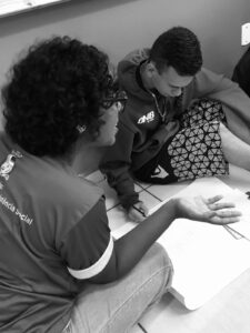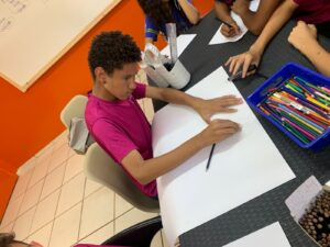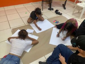 Uma mesa silenciosa, com papéis e canetas disponíveis, onde visitantes poderão relatar de forma anônima experiências pessoais ou conhecidas envolvendo bullying ou ciberbullying. Esses relatos serão transformados em um vídeo produzido pela turma de mídias.